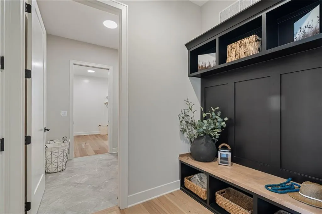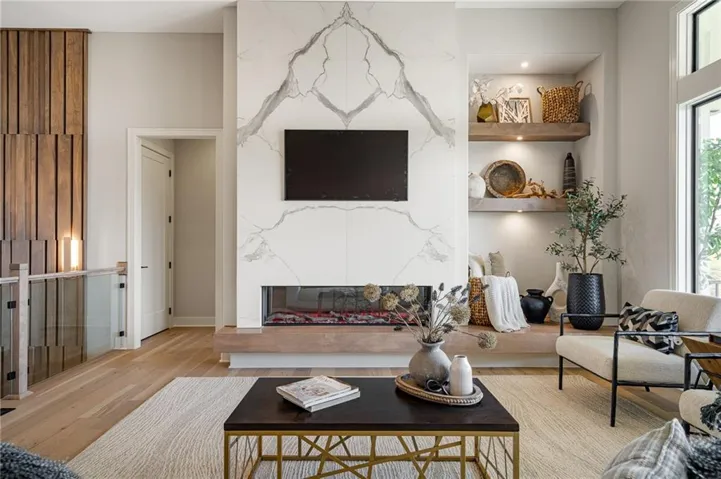 – A striking great room fireplace featuring elegant white marble and a sleek linear design