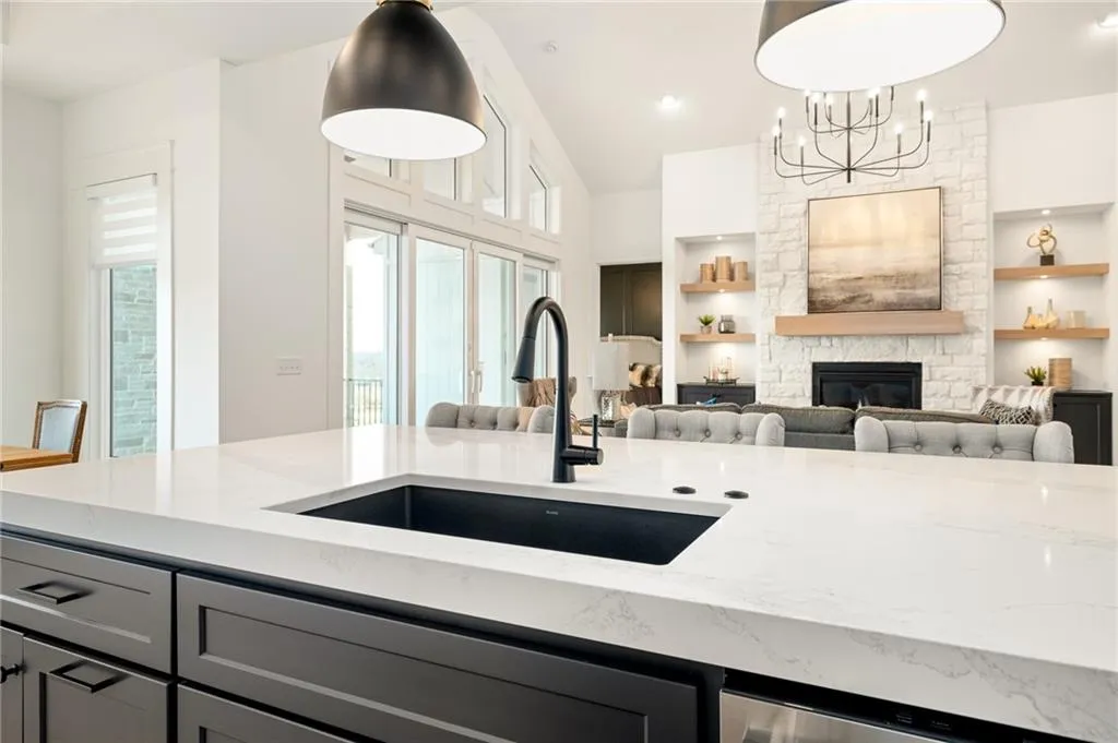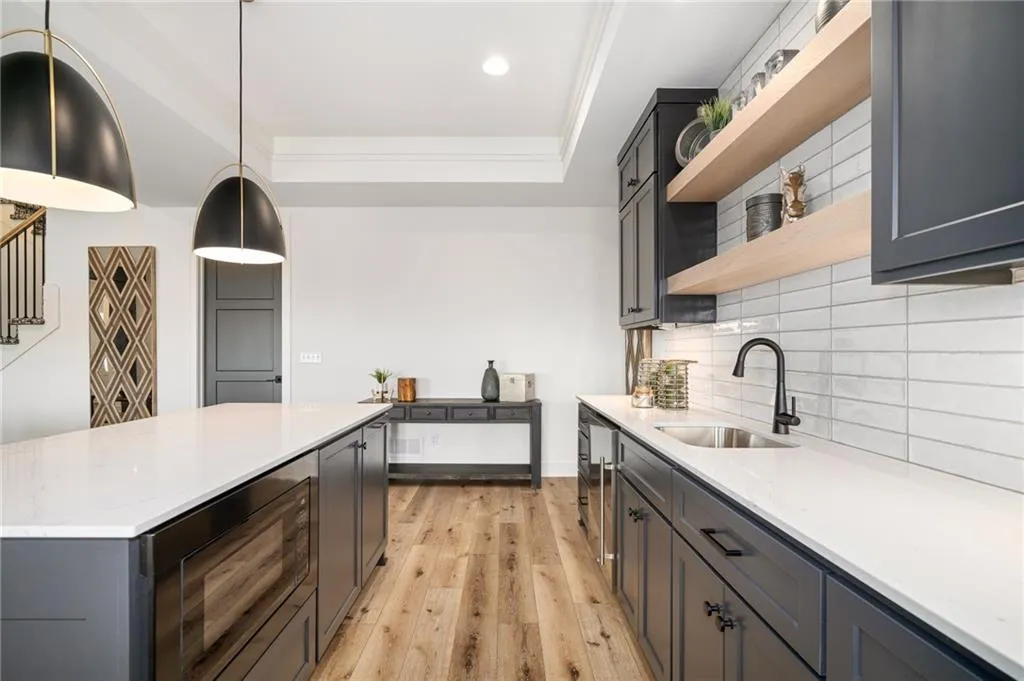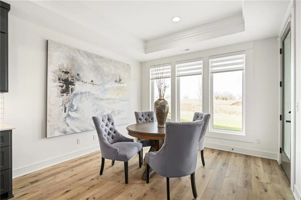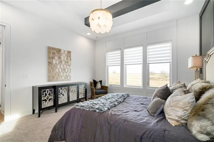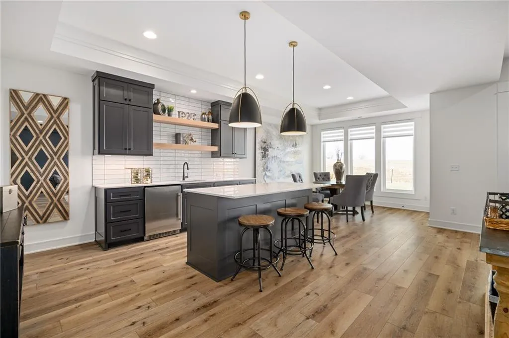 JFE Construction brings their fabulous Bayberry reverse 1.5-story plan to Johnson County’s newest maintenance-provided community of Prairie Canyon! This beauty sits on a walkout lot with E rear exposure backing to greenspace w/dramatic long vistas! From the moment you enter this home through grand double doors, the dramatic, cathedral-vaulted living room, combined with a back wall of windows/doors make it feel so spacious, light and bright. The great room is cozy and inviting with a stone fireplace, built in cabinets with floating shelves above and designated lighting. Enjoy your time with friends and family in the beautifully designed kitchen featuring warm wood beams, quartz counters, gooseneck faucet, s/s appliances, under cab and cab lighting, and beautiful built-in hutch. Expansive butler’s pantry/coffee bar with extra storage on the side. Large primary suite with gorgeous wood-feature wall attaches to en suite with free standing tub, double bowl vanity, zero entry shower, and sizable closet with 3rd tier pull down supports. Laundry room with custom cabinets opens to the closet. Second bedroom or office on the main with hard wood floors and decorative trim details. Relax in the evenings and enjoy the outdoors on the covered deck with gas fireplace. Don’t forget about the finished lower level. The u-shaped staircase, designer carpet, modern lighting and mirror bring out the allure of this home. Downstairs finished in LVP, you’ll find a spacious family room with TV area, game area, full bar (microwave/bev. fridge), & 2 additional bedrooms w/full bath. Lower level stubbed for an extra bathroom. Tons of storage space. Come out and see the beautiful landscape of Prairie Canyon. Your time can be your own – yard work, mowing, trimming, weeding, edging, fertilizing, and snow removal for just $200 per month. Prairie Canyon is Johnson County’s newest maintenance provided community conveniently located just west of Hwy 7 on College Blvd. This one checks ALL THE BOXES!