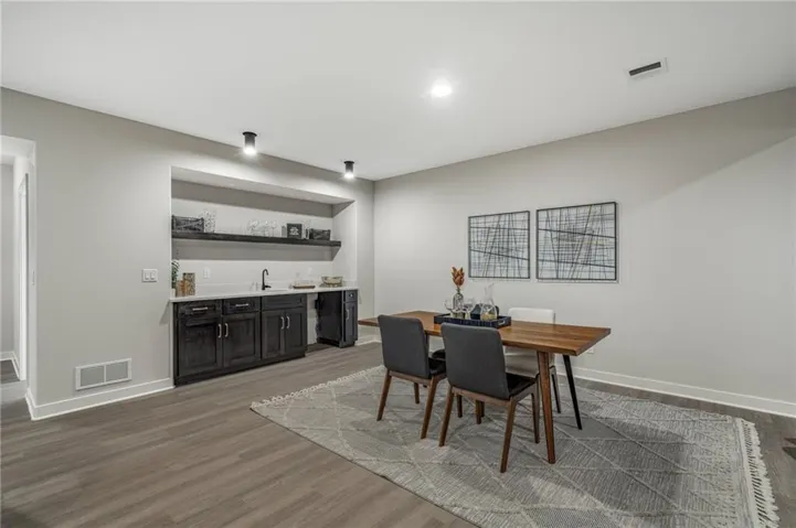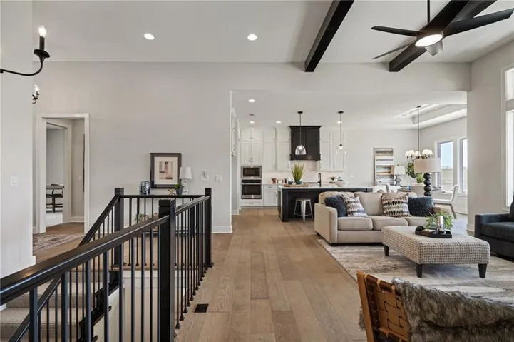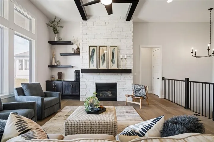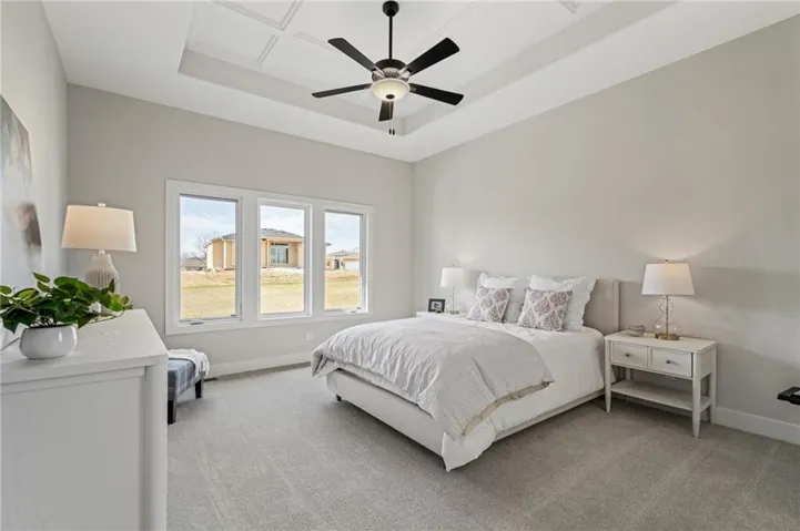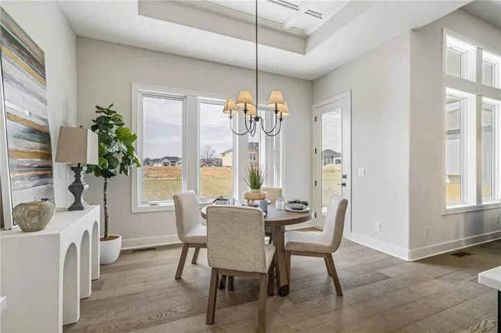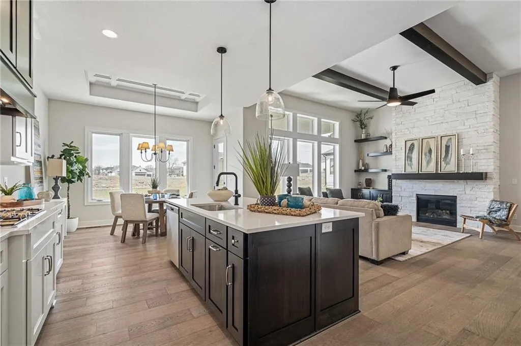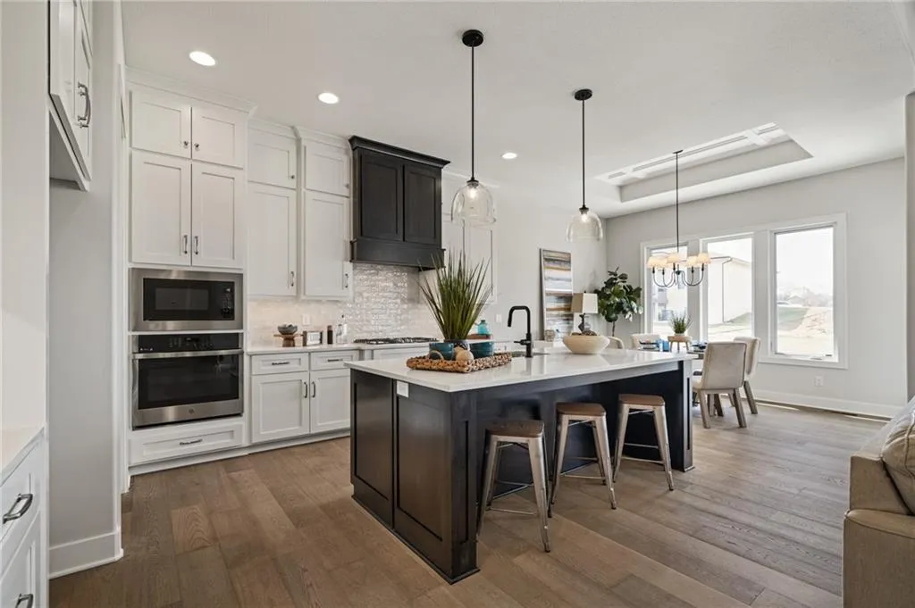 Discover the “Sicilian II” from Pauli Homes — a contemporary take on the ever-popular “Riviera” floor plan. It preserves the style and functionality you love while fitting into a more compact, intelligently designed footprint. The bright, open main level spans 1,826 square feet and is built for effortless daily living and effortless entertaining. It features a generous great room that flows naturally into a stylish kitchen anchored by a large island — ideal for meal prep, casual dining, or hosting friends. Abundant windows surround the dining area, bathing the space in natural light. The luxurious primary suite offers a true retreat, complete with a spa-like bathroom featuring a freestanding tub, dual quartz vanities, and a spacious walk-in shower. Laundry is conveniently accessible from both the primary closet and the main hallway. Downstairs, the finished lower level delivers an impressive 1,294 additional square feet of versatile living space, including a recreation room, a walk-up wet bar, a flexible bonus room, two bedrooms, a full bathroom, and abundant storage options. Come see this gorgeous home in Olathe’s newest maintenance provided community! Maintenance includes: lawn, trimming, mulch, sprinkler system & snow removal.
